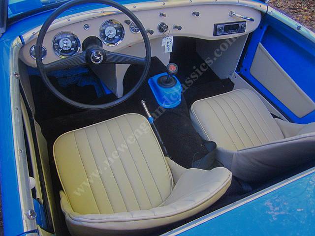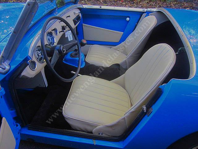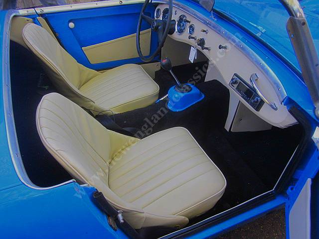 New light tan interior, brand new top, side curtains, and tonneau, very good chrome (what little there is but it is common for a Bug Eye to not have a front bumper assembly which this car, of course,has), all working original instruments and switches, correct wheels and hub caps with new Vredestein H rated radials. And in the drive train and electrical system: engine is a 1275 unit, painted and detailed, compression: 150-153 psi in every cylinder, 85 psi oil pressure cold and 70-75 psi at operating temperature, zero smoke cold or hot, rebuilt twin HS2 SU carbs (far better the ancient H1 carbs when new), .new wiring harness, gearbox is a bit noisy in 1st, but good synchromesh, and a noisy 1st is rather common in cars such as this.