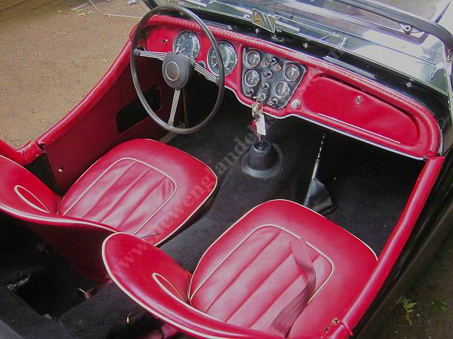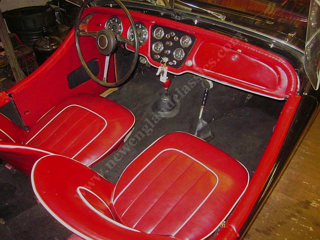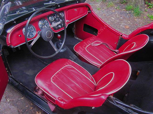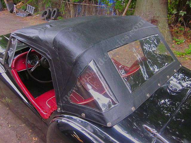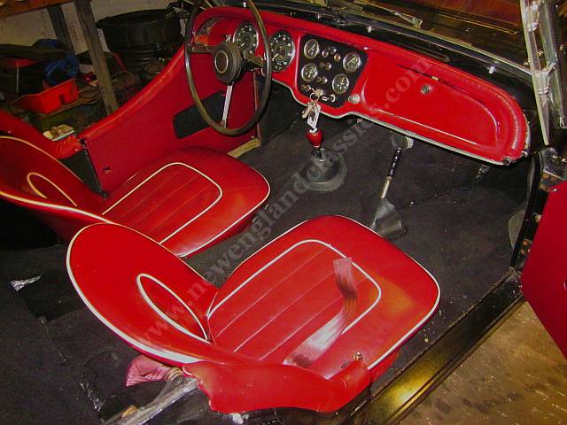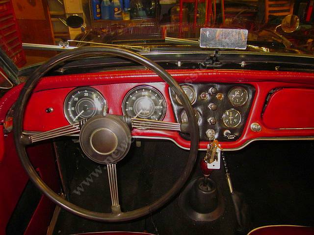 Wire wheels fitted to the car with new splined hubs, brand new convertible top, a good pair of side curtains, stainless steel exhaust, very clean engine bay and trunk compartment, and it certainly appears that the entire interior is new. And few better color combinations than black outside, red (with white piping) inside.