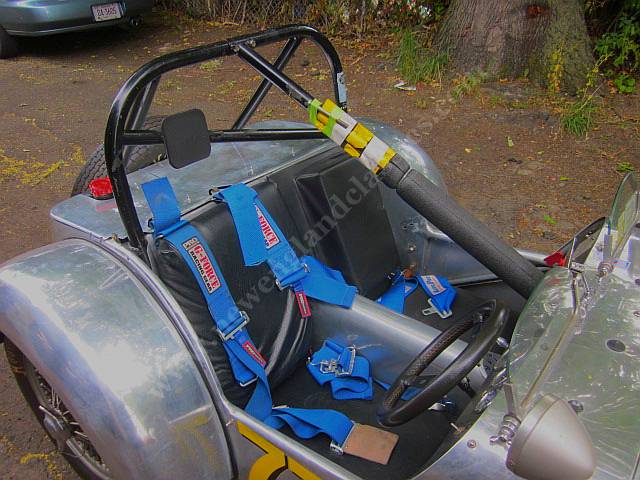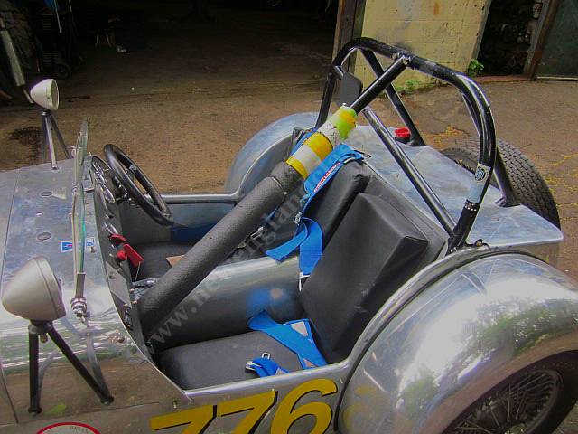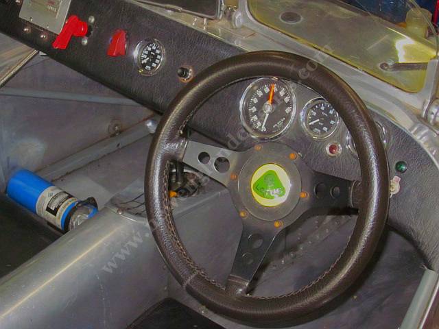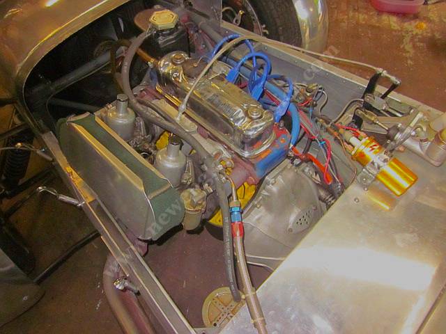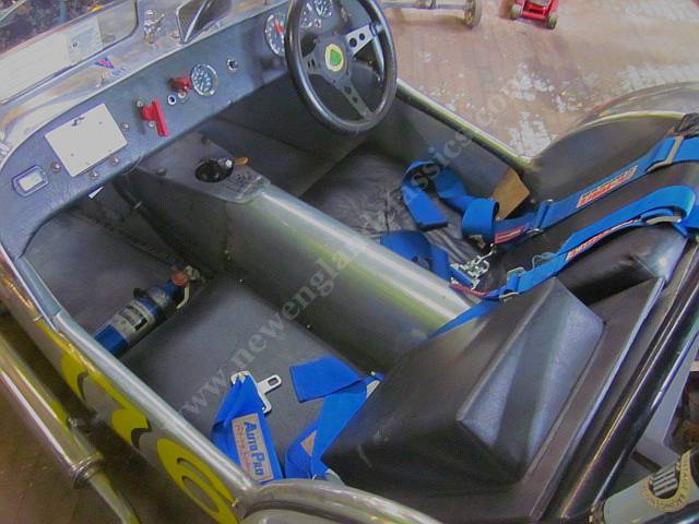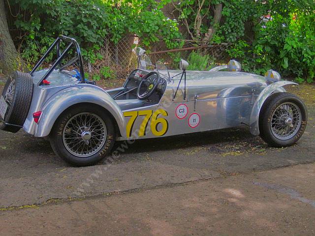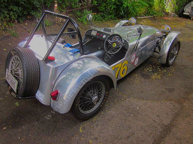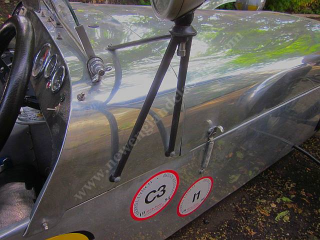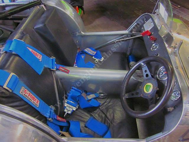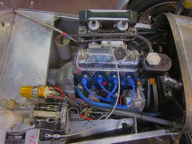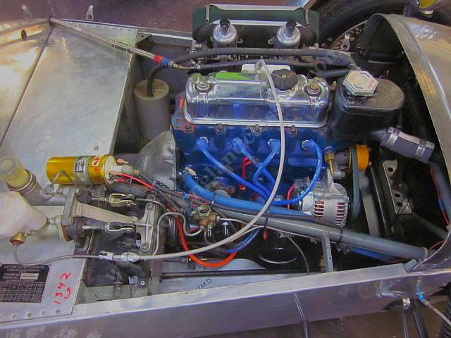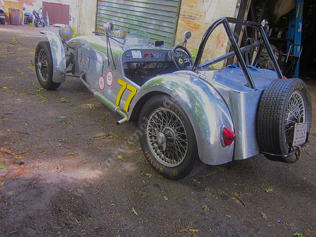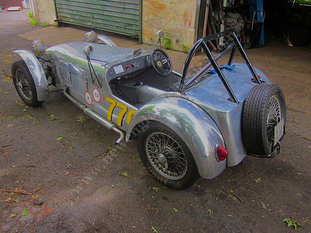 Tubular space frame with stressed alloy floors and tunnel, polished aluminum body by Williams and Pritchard, cycle fenders, 15" wire wheels with Hoosier Fm Vee tires, roll bar, racing fuel cell, dual master cylinders, competition brake linings, new Aeroquip brake lines, fuel prrssure gauge, solid state fuel pump, oil cooler, proper oil and coolant catch bottles, even an hour meter on the dash. Also has a removable front roll bar strut, in for race/out for road use.