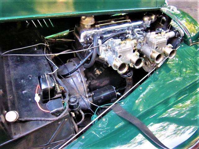 To a certain degree, this car is a rough duplicate of the factory built high performance cars. An excellent 4/4 chassis/body with new BRG paint, all new Camel interior, wire wheels, disc brakes, and a TR4 engine with a new pair of 40 DCOE Weber carbs. Mated to an all synchromesh TR4 four speed gearbox (far easier to drive than the pre war Moss gearbox as originally used by Morgan).