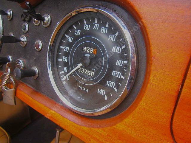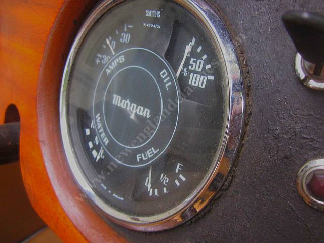 Excellent wood dashboard (appears original), and with (rare for a Morgan, typical on a 1967) glove box door. No big deal for most cars but positively remarkable for a Morgan. And a 140 mph speedo (also specific to a 1967). And another little `find` which I have seen in very few cars....what is probably original and near identical to the one I have seen on late 1967 Rolls Royces and Lotus cars....a cute little panel with a four way flasher switch and light (and it works). A 1967 Morgan with four wheel flashers? From what I understand, when the EPA and DOT regulations took effect on January 1st, 1968, the two government organizations had a different interpretation on `dates.` With the EPA working on date of manufacture while the DOT dealt with `model year.` AND IF a 1967 Morgan was to be sold as a 1968 model year, Morgan did a preemptive attack on the upcoming regulations by offering this one particular unit on their late 1967 cars.