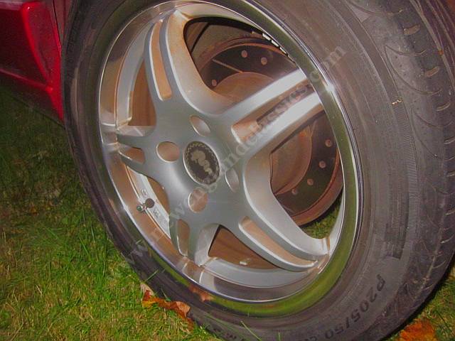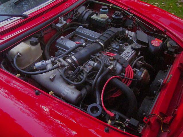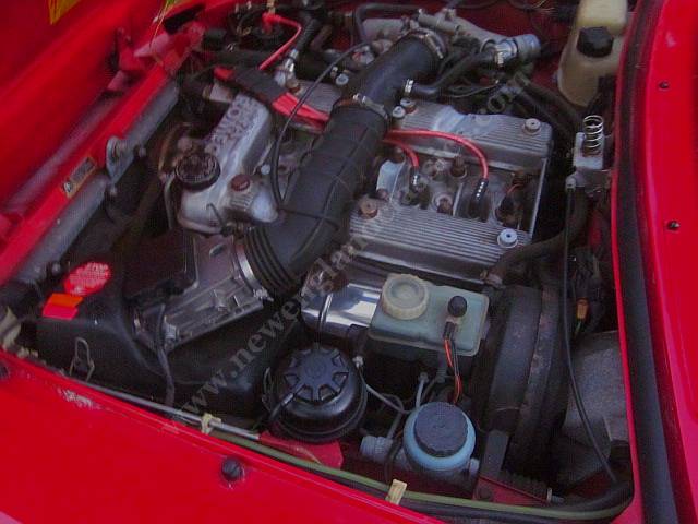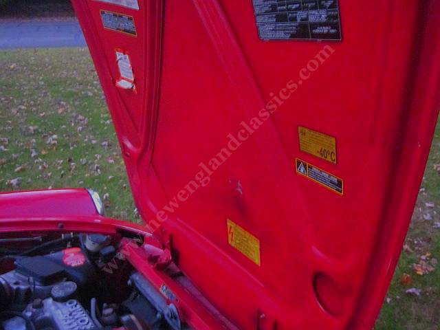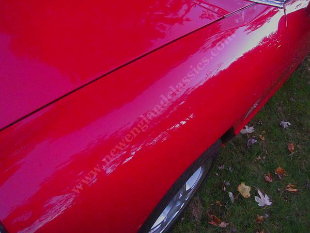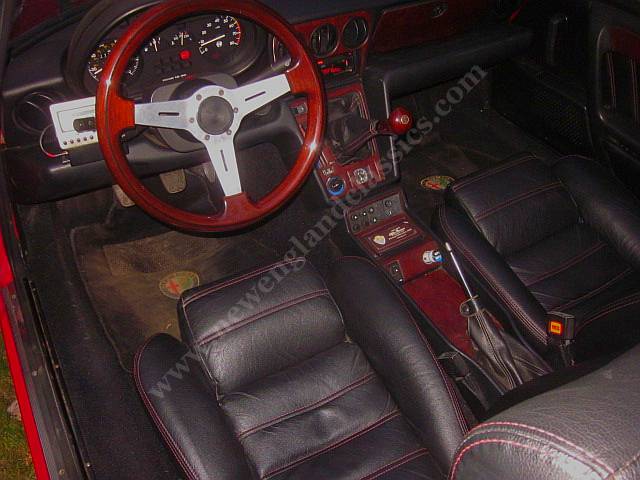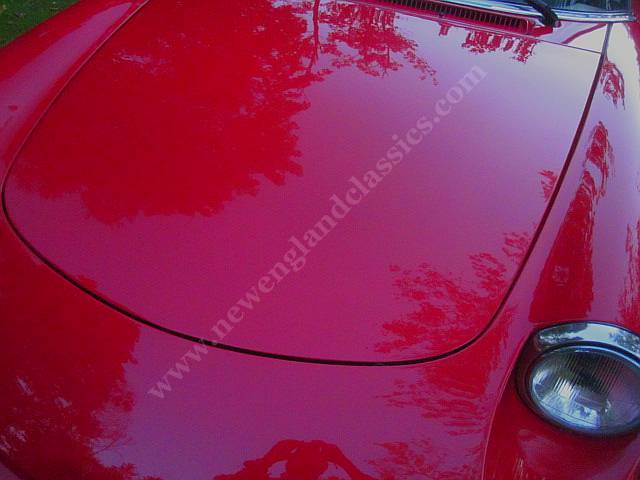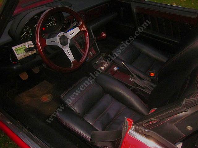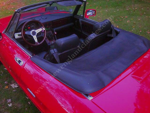 And this is what I got: absolutely rust free body and chassis/floors (no patching or repairs), show quality deep red paint, new black leather with red stitching, wood steering wheel and dash kit, rebuilt engine (zero smoke cold or hot, 60-80 psi oil pressure when hot, last owner told me he added $12,000 in extras not including the engine rebuild, paint or anything basic to the car: New ANSA exhaust, new Bilstein shocks, new front adjustable control arms, new Serpent Autosport 16` wheels with Pirelli P Zero super high speed 205/50 Z rated radials, new JVC stereo/CD with iPod connection, new cloth top, boot cover, chassis stiffener (basically a square tube rectangular secondary chassis), oil pan guard, slotted cross drilled disc rotors on all four corners.