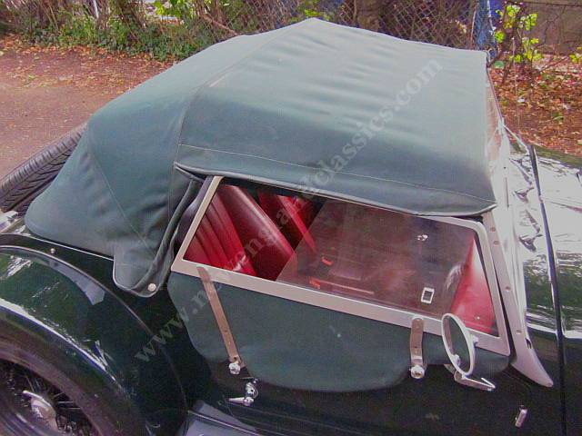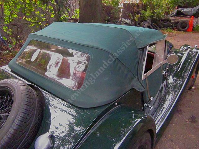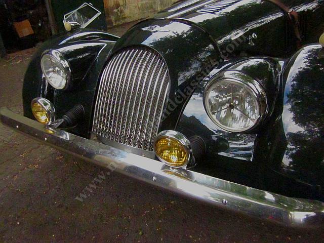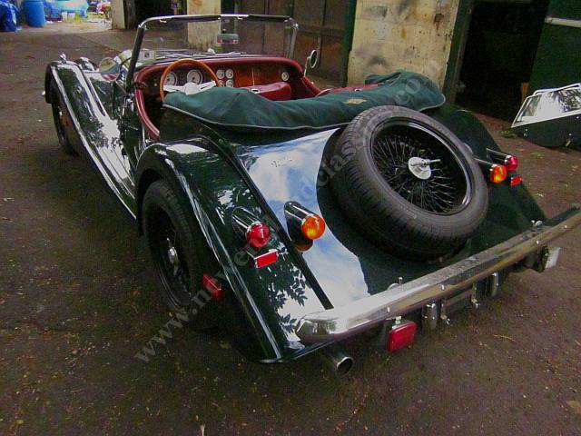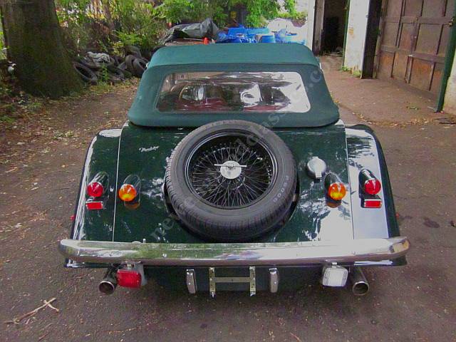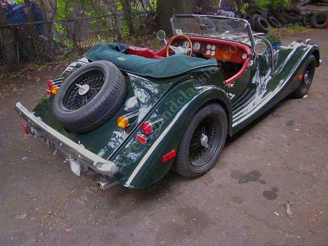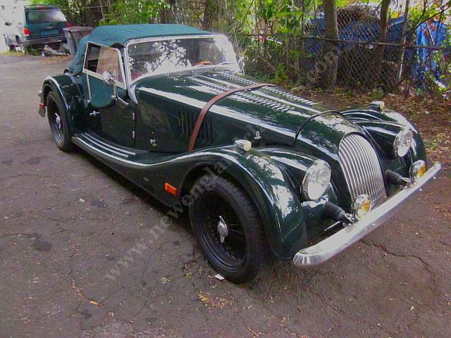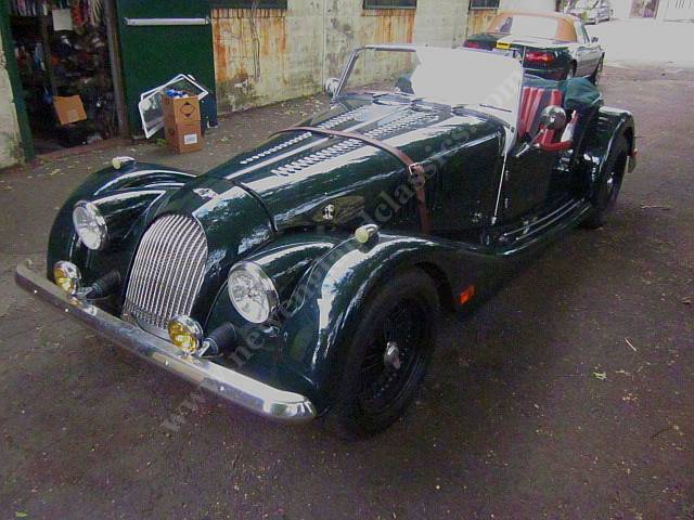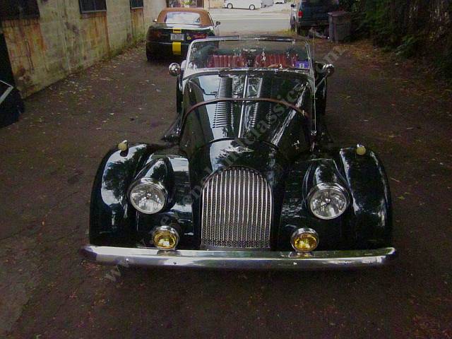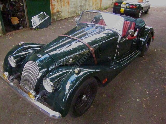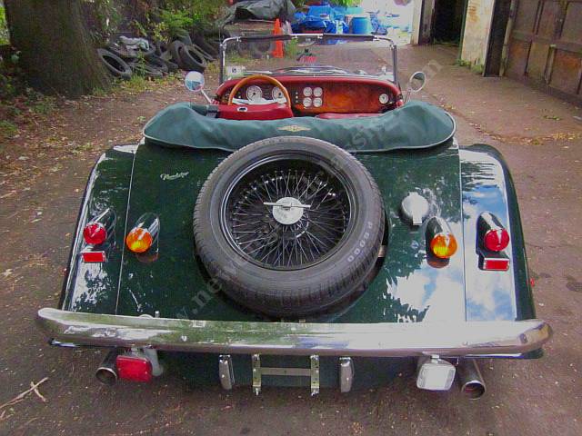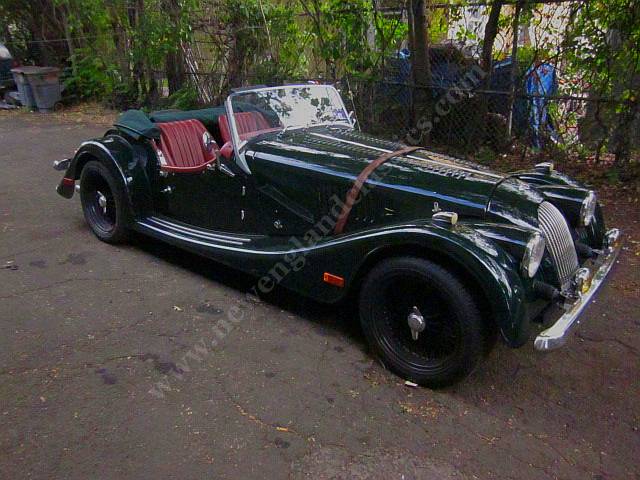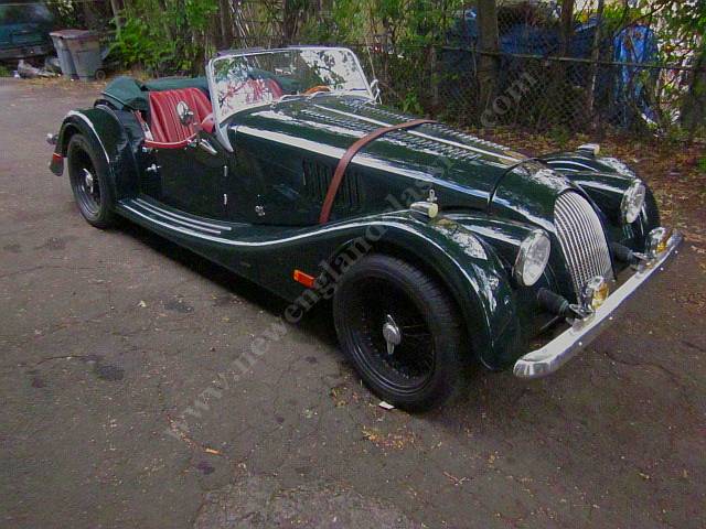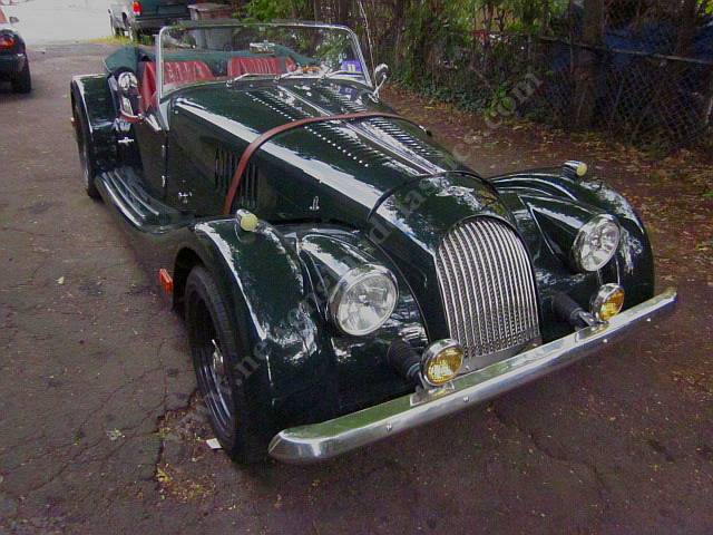 Car has leather adjustable seats and interior, air conditioning, stereo/CD, burl wood dashboard, excellent fit from its green top (which, incredible for a Morgan, goes up and down in a snap) and side curtains, painted in Connaught green, You might say, lots of goodies.